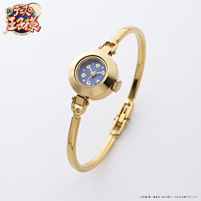 細いバングルベルトはゴールドカラーを採用。手首をより華奢に、上品に見せてくれる。また、ガラス周りのリング状のパーツであるベゼルはそれぞれの学校イメージに合わせ、2パターン用意チャームは、王冠とテニスラケットをモチーフに、学校ごとのイメージカラーのストーンがアクセントとして輝くデザインだ。