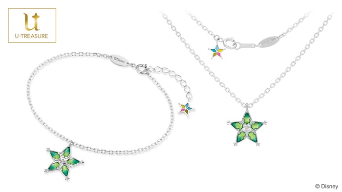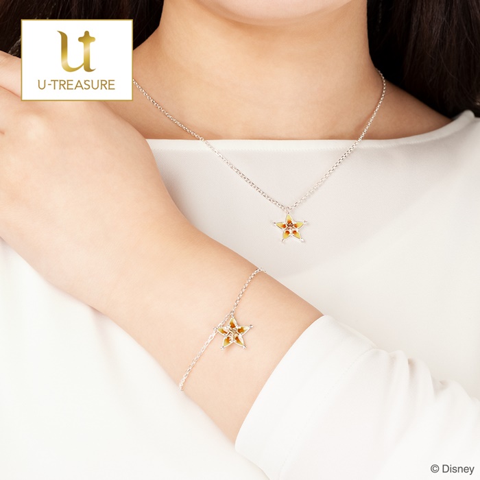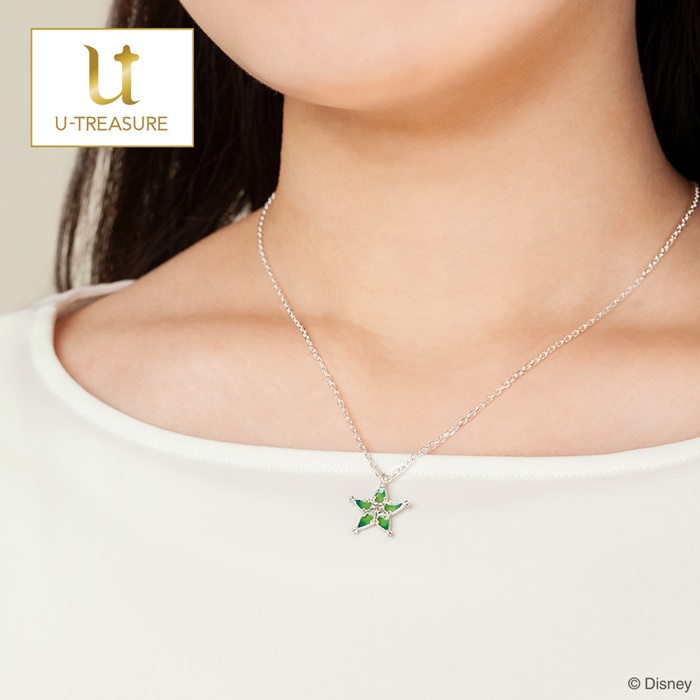 目を引くカラーは、職人の手作業により色づけられた日本の伝統工芸“七宝(※)”によるもの。ジュエリーブランドならではの、繊細で深みのあるアイテムに仕上がっている。ネックレスの後ろ側には、つながりのお守りについている5色のチャームをデザインされており、細部に至るまで忠実に再現。つながりのお守りを手に、アクア・テラ・ヴェントゥスの3人が満天の星空の下で互いの絆を確かめ合ったシーンがよみがえるよう。身に着けることで、大切な人との心のつながりを感じて…。