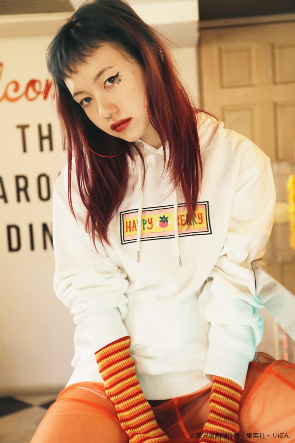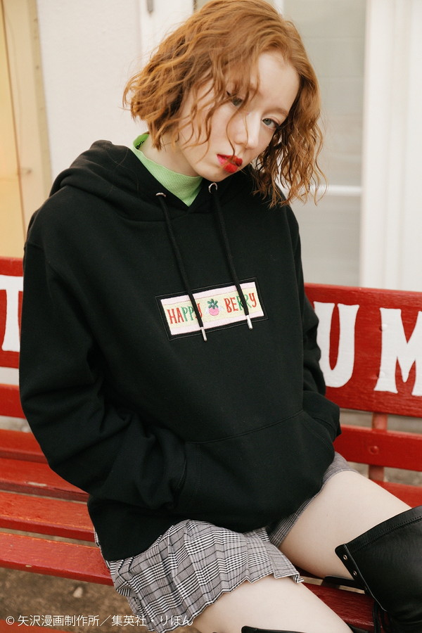 フロントには作品内に登場する実果子のブランド“HAPPY BERRY”のロゴが刺繍され、カラフルな配色で、ポップでインパクトのある実果子のイラストをプリントで仕上げられたフーディー。柄ボトムにマーチンやスニーカーを合わせたストリートスタイルや上からシースルーアイテムをレイヤードするキャッチーな甘辛MIXスタイルもおすすめ。