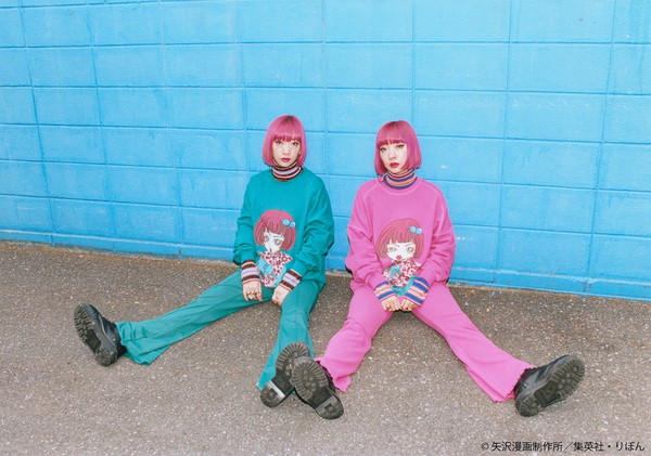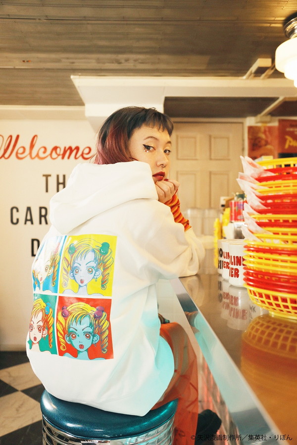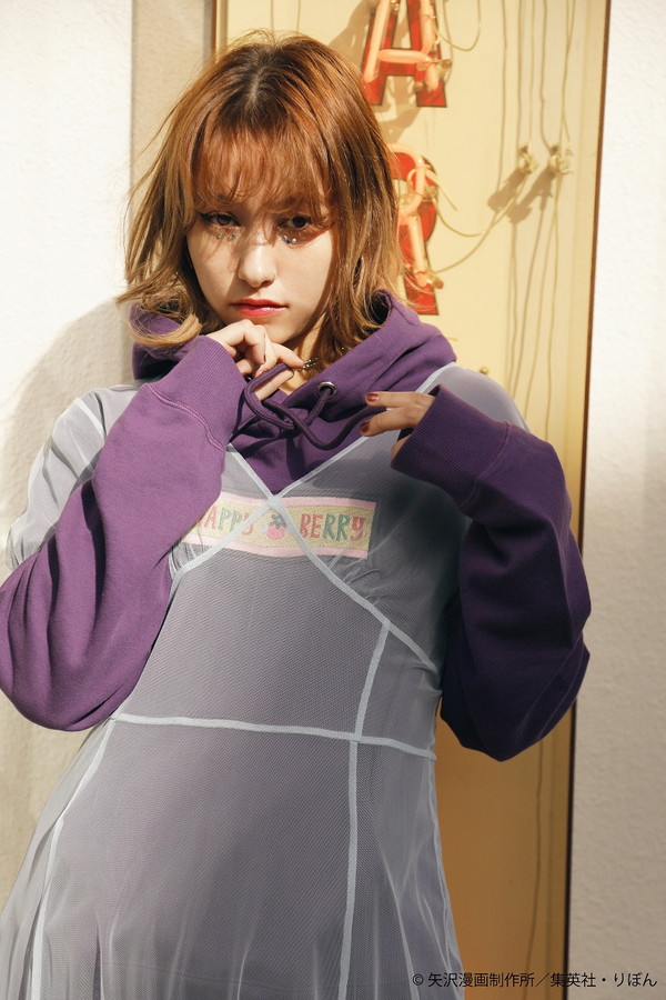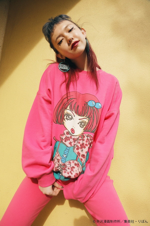 作品内で思い切って髪をピンクにする実果子。ピンク×グリーンやブルーなどキャッチーなカラーコントラストが目を惹くお気に入りのイラストと、欠かせないタイトルロゴを後ろに刺繍したプルオーバー。オーバーサイズで、ワンピースやブラウスをレイヤードするMIXスタイルや網タイツなどを合わせるグランジスタイルもおすすめ。