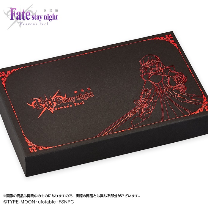 パッケージには、インクラベルやブロッターカードとは異なる“バイザー”を付けているデザインの“セイバーオルタ”の立ち絵が赤色の箔押し加工で施され、蓋を開くと劇場版『Fate/stay night[Heaven’s Feel]』第二章に登場するシーンをデザイン予定している。お楽しみに。