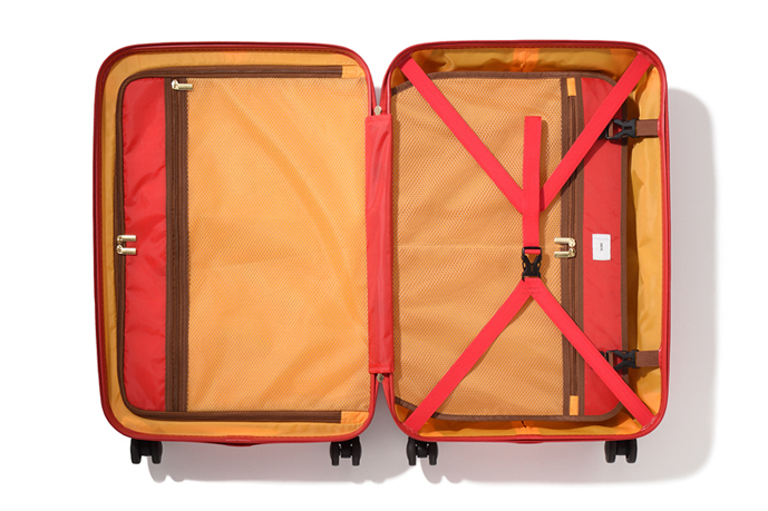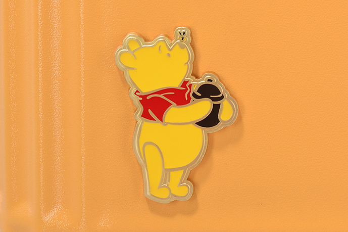 ボディ左下にはハニーポットを抱えるプーさんを描いたバッジがあしらわれている。ファスナーには今にも零れ落ちそうなハチミツを模ったキュートな引き手が。スーツケースをすっぽりと覆う付属カバーにもプーさんが描かれ、小さな耳がちょこんと付いている。カラーはプーさんをイメージしたイエローとレッドの2色展開。