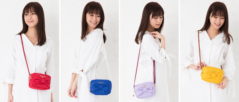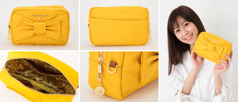 蝶ネクタイをイメージしたデザインに、単色使いの生地と金のロゴがあしらわれ、シンプルかつ上品に仕上げられている。幅180mm、高さ120mmと、メイク道具がたっぷり入るサイズ。また、ちょっとしたお出かけ時に、付属のストラップをつけてショルダーポーチにもできる2WAY仕様。