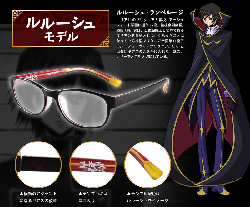 主人公のルルーシュ・ランペルージをイメージしたメガネフレーム。テンプルには横顔のアクセントになるギアスの紋章が入り、テンプルの配色はルルーシュの制服をイメージしたクラシックなデザインとなっている。