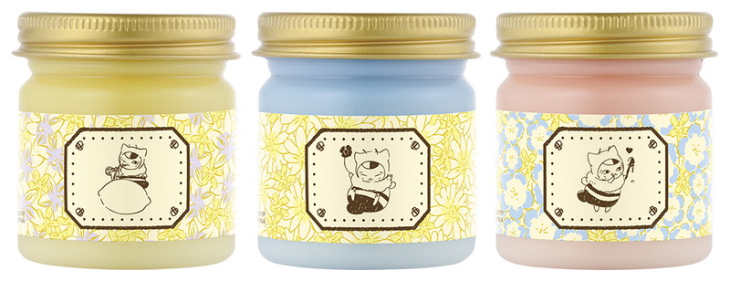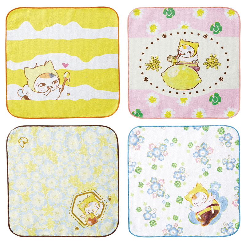 ビッグサイズの“みつばちぬいぐるみ、“でっかいのせこっとぬいぐるみ”をはじめ、“ハニカムじゅうばこ”、れもんやお花やベリーの“はちみつのかおりハンドクリーム”、“ガラスびん”、“ハンドタオル”、“みつばちニャンコ先生チャーム”には、みつばちの着ぐるみをまとったニャンコ先生がデザインされている。