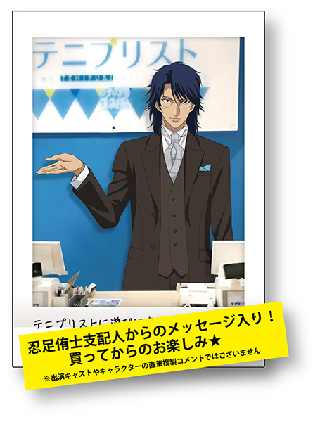 【テニプリスト限定BOX購入特典】でもらえるのは、本ストアの支配人を務める氷帝学園中等部の忍足侑士のメッセージ入りぱしゃこれ。テニプリスト店頭では2月15 日(金)から予約開始となる。