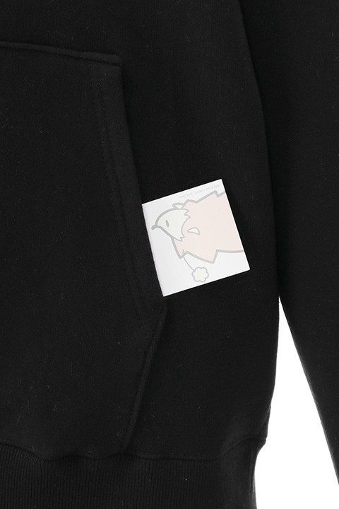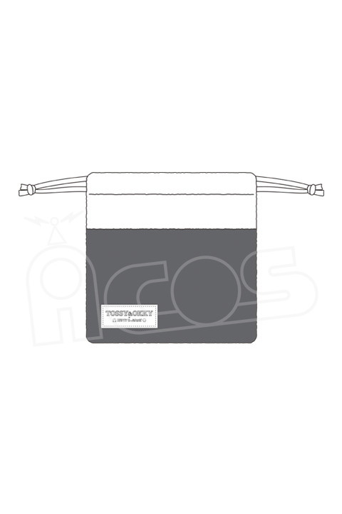 短い毛足のボア素材が使用された手触りのよい巾着タイプのポーチ。キャラクターをイメージしたバイカラーの本体に、イラストが刺繍であしらわれている。
