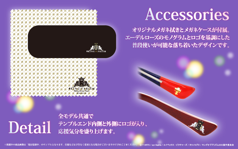 新シリーズの主役である、プリズムスタァ候補生たちをイメージした“世界が輝いて見える”メガネ、全7種がラインナップ。オリジナルメガネ拭きとメガネケースも付属し、全モデル共通でテンプルエンド内側と外側にロゴ入り。応援上映にもお勧めのアイテムだ。