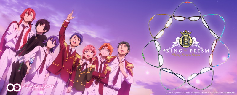 アニメ『KING OF PRISM -Shiny Seven Stars-(キングオブプリズム シャイニーセブンスターズ)』劇場公開記念コラボフレームが、メガネフラワー店舗とオンラインショップにて、 3月16日より発売される。 価格は薄型非球面レンズ付き9,000円+税、フレーム単品7,000円+税。