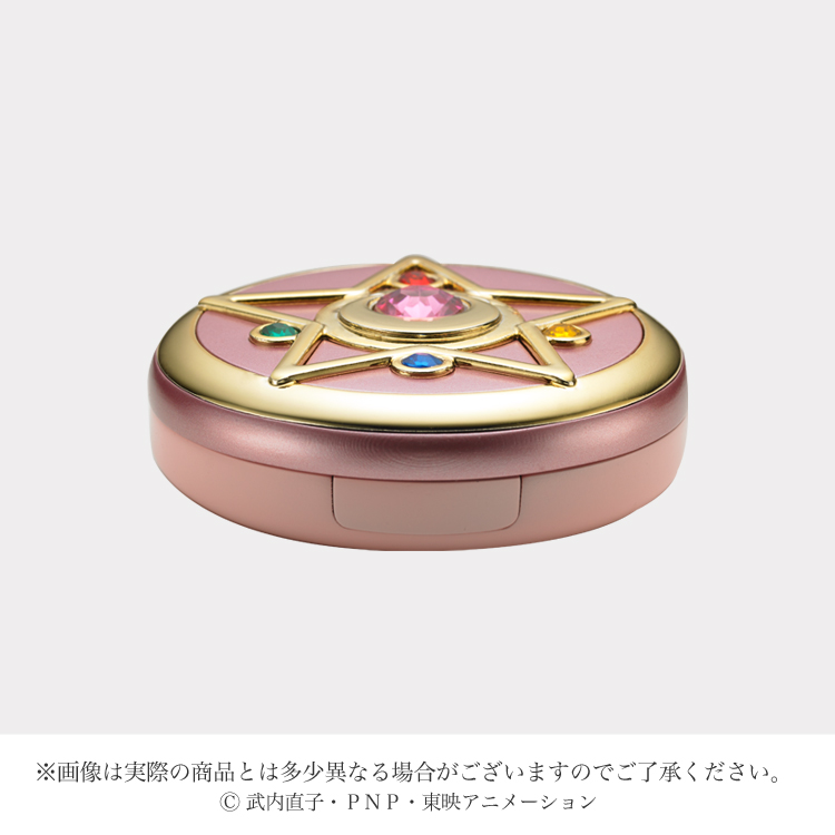 このコスメは、アニメ『美少女戦士セーラームーンR』に登場するセーラームーンの変身アイテム「クリスタルスターコンパクト」をモチーフにしたフェイスパウダー。上蓋に5色のストーンをあしらった、キラキラパールのオトナピンクカラーのコンパクトは、ポーチに入れて持ち運ぶのに便利な薄型の形状にデフォルメされている。オトナ女子も持ちやすい高級感あるコンパクトながら、専用レフィルの交換ができ、実用性にも優れている本格コスメ。