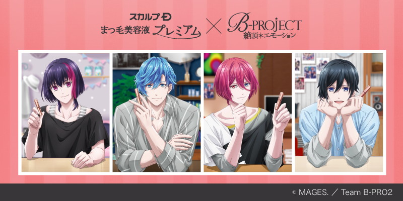 当コラボレーション企画では、スカルプDのまつ毛美容液シリーズと“描き下ろし限定ノベルティのセット”が用意。まつ毛美容液プレミアムのイメージキャラクターを務める“B-PROJECT”のメンバーの是国竜持、愛染健十、音済百太郎、寺光唯月が特別に描き下ろされており、ここでしか手に入らない限定デザインとなっている。