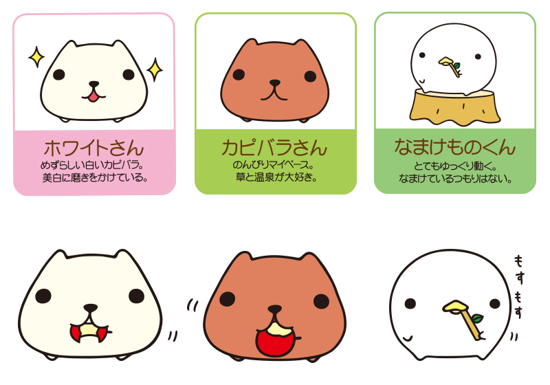 “カピバラさんフラワーBOX”は、ミドリノ草原に住み、草とりんご、温泉がだいすきな『カピバラさん』、めずらしい白いカピバラで、美白に磨きをかけている『ホワイトさん』、とてもゆっくりと動き、お金と思い込んで葉っぱを集めている『なまけものくん』の3つのキャラクターを枯れないお花で描いたプリザーブドフラワーBOX。