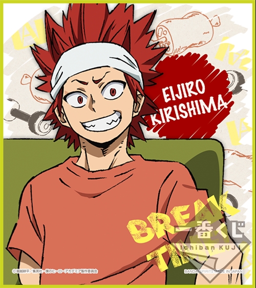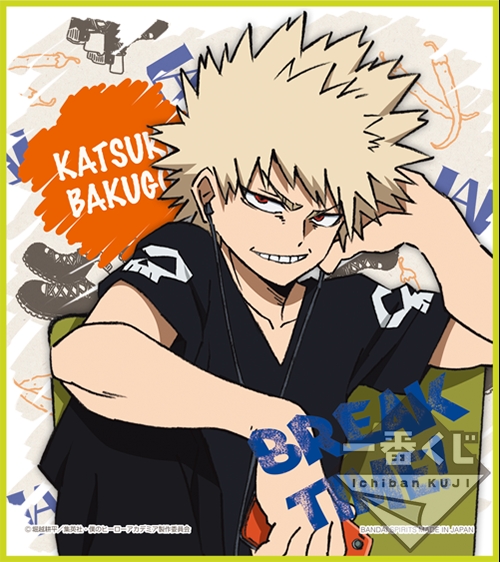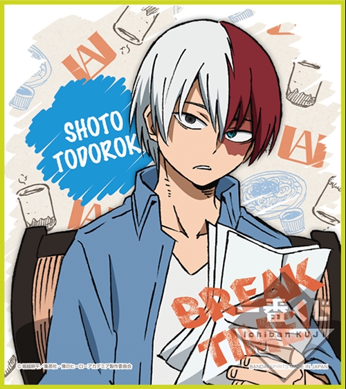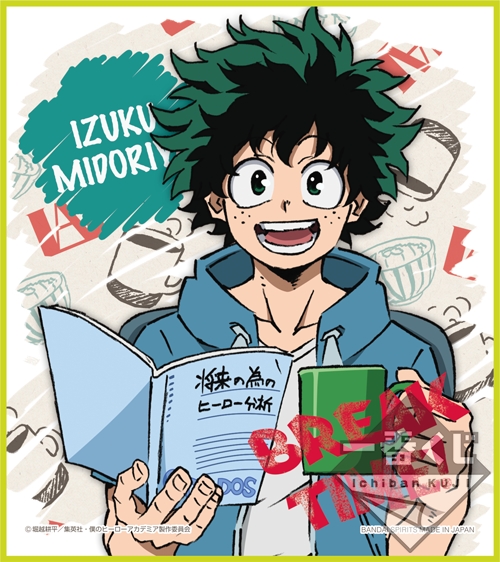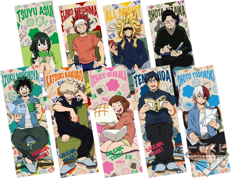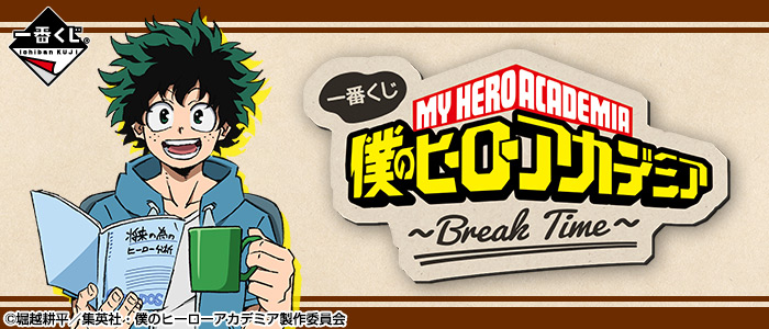 『一番くじ 僕のヒーローアカデミア~Break Time~』が2019年4月13日より、書店、アニメイト、アニメガ、TSUTAYA、ホビーショップ、ゲームセンター、ジャンプショップ、デイリーヤマザキなど(※店舗により取り扱いのない場合や発売時期が異なる場合がある。なくなり次第終了。)で順次発売される。価格は1回620円(税込)。