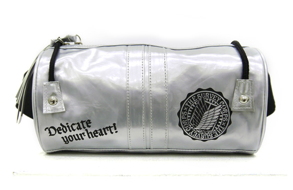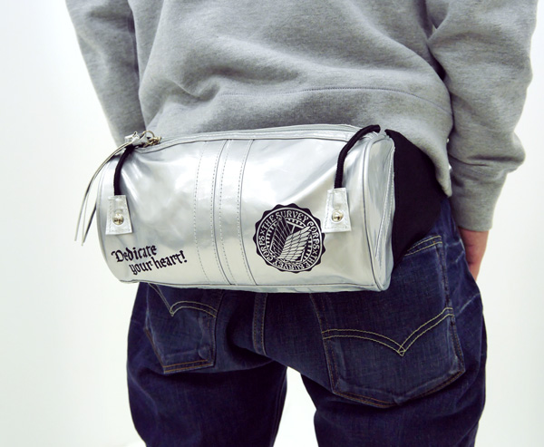 立体起動装置をイメージしたウエストバッグ。メタリックの生地を使用したバッグには、「自由の翼」のマークと「心臓を捧げよ!」の英文をプリント。肩からかければショルダーバッグとしても使えます。