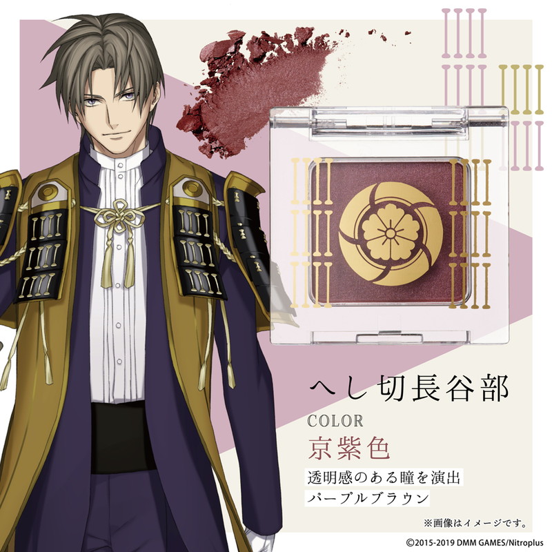 ラインナップは全3種で、使いやすいベーシックカラーを基調とした亜麻色(山姥切国広)・淡藤色(山姥切長義)のAセット、トレンドのアクセントカラーを採用した京紫色(へし切長谷部)・茜色(加州清光)のBセット、まぶたに陰影をつけて立体感を与える伽羅色(大倶利伽羅)・焦茶色(燭台切光忠)のCセット。単品使いはもちろん、セット内のアイシャドウを組み合わせて使うことで、より一層華やかな印象のメイクアップを楽しめる。