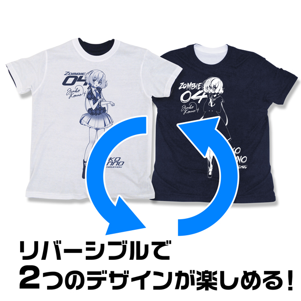 “紺野純子 リバーシブルTシャツ”は、ライブの時はアイドル面、普段はゾンビィ面とシチュエーションや気分に合わせて使い分けもできる。これらを身に着け、“フランシュシュ”の活躍を応援しよう!