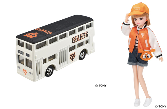 “トミカ”は、ジャイアンツカラーをベースにしたロンドンバスで、パッケージもジャイアンツオレンジを表現した特別仕様。“ジャイアンツ リカちゃん”は、ジャイアンツオレンジをポイントにしたオリジナルデザインとなっている。