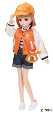 ロゴ入りスカジャンと帽子、イヤリング、『読売巨人軍』のマスコットキャラクターであるジャビット風ポシェットをコーディネート。ショートヘア、デニムのショートパンツに真っ白なスニーカーで、スポーティーなイメージの“リカちゃん”だ。