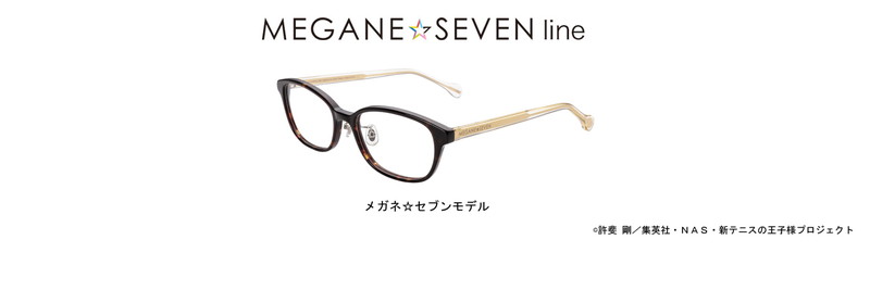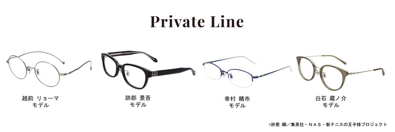 プライベートラインは越前リョーマ、跡部景吾、幸村精市、白石蔵ノ介の全4種類。スクールラインはテニスの全国大会出場校5校をラインアップした全5類をラインアップ。 さらに、作品に登場するメガネキャラクターが集まったユニット“メガネ☆セブン”のための特別なMEGANE☆SEVEN Line(メガネ☆セブン ライン)を合わせ、全10種類のコラボレーションメガネが発売される。