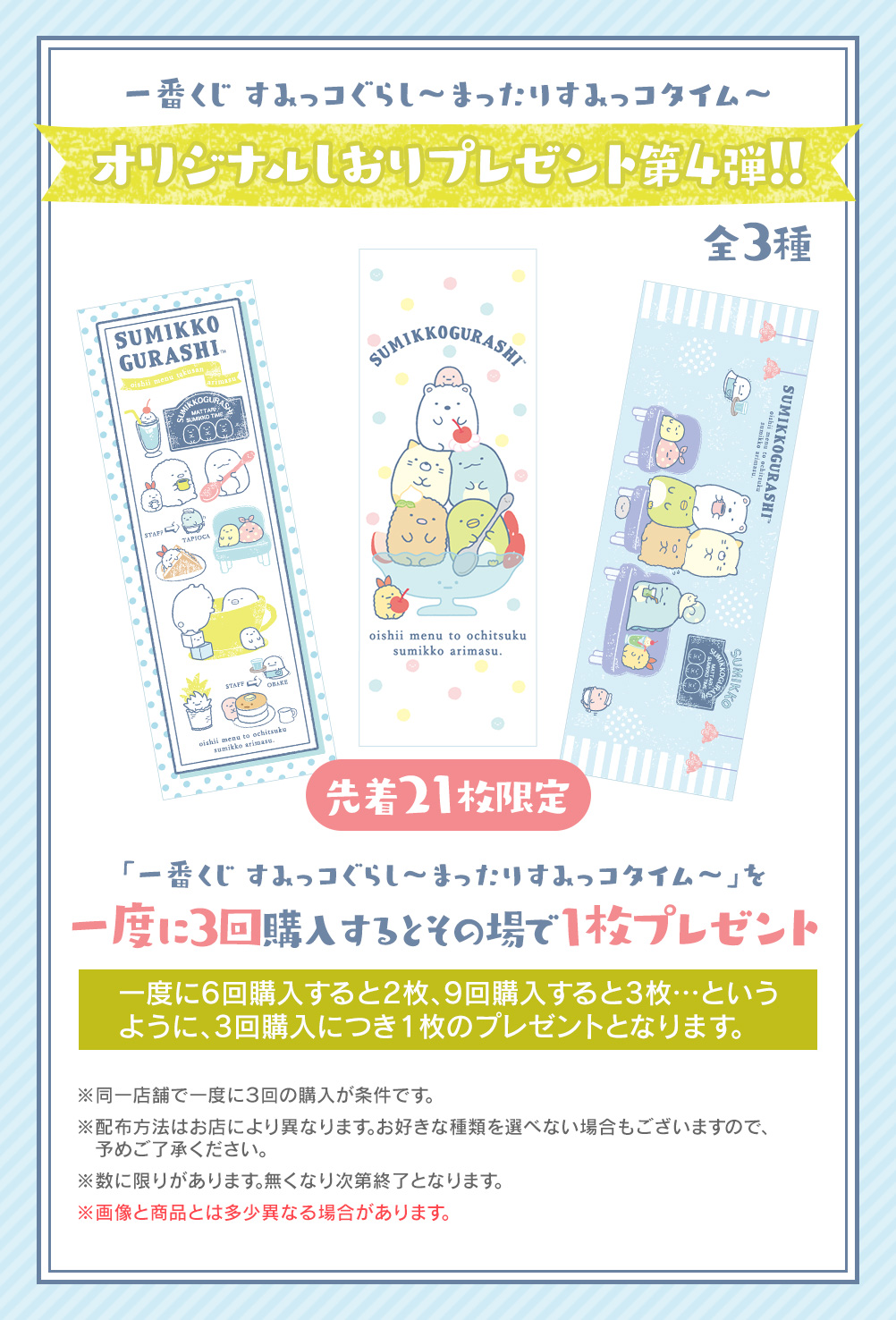 『一番くじ すみっコぐらし~まったりすみっコタイム~』を一度に3回購入すると、その場で特製しおりが1枚(全3種)もらえる。先着21枚限定。