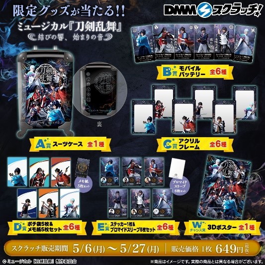ハズレなしのオンラインくじサービス『DMMスクラッチ』にて、5月6日より“ミュージカル『刀剣乱舞』~結びの響、 始まりの音~ スクラッチ”が1回649円+税で販売される。
