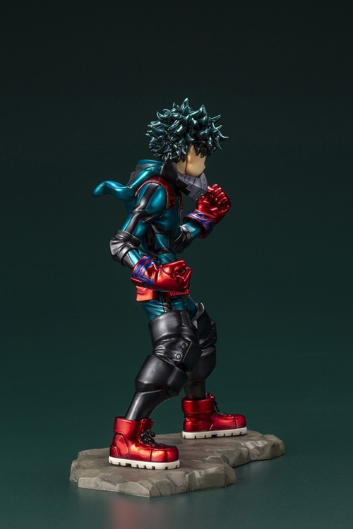“ARTFX J 緑谷出久”のコスチュームの一部が“赤”に変更され、さらにメタリックカラーをプラスした特別限定カラーVer.で赤と緑の鮮やかな輝きと黒の鈍い輝きのコントラストが非常に目を惹く。コスチュームだけではなく、髪にも光沢感のある美しいメタリックカラーを施した本商品は、非常に重厚感溢れる一品となっている。