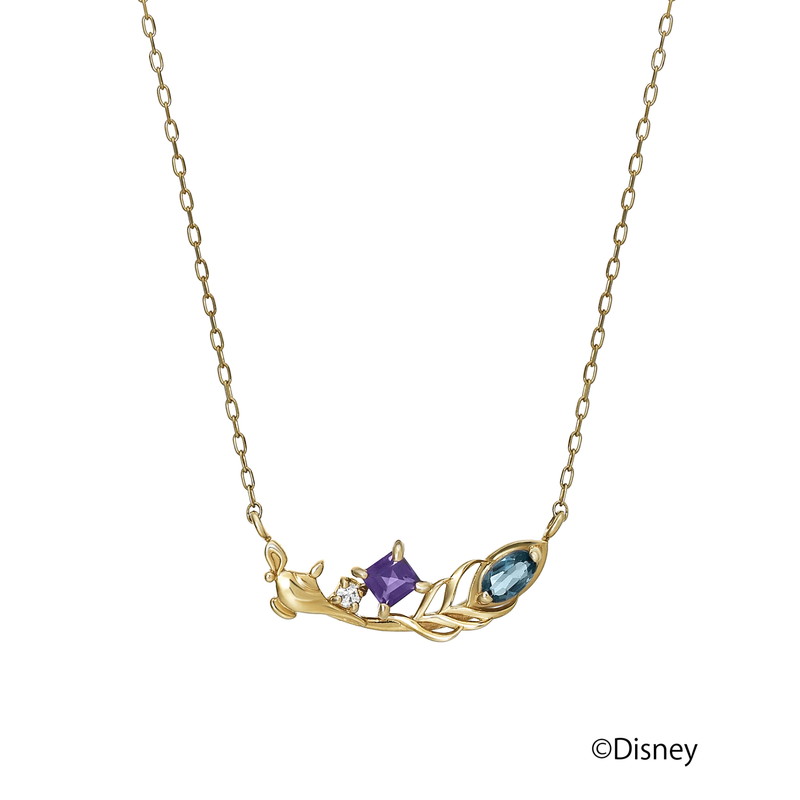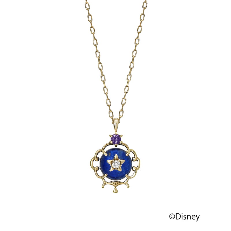 アラジンが砂漠の洞窟で見つけ出した魔法のランプ。ランプから溢れる魔法の煌めきをダイヤモンドで表現し、アグラバーの美しい姫、ジャスミンを孔雀の羽で表現。孔雀の中心のブルーの石はジャスミンのドレスのイメージだ。センターで輝く紫の石はアラジンの紫色のベストを表している。全体がジャスミンのイメージカラーでまとめ、アラジンの世界観溢れるネックレスに仕上がりました。