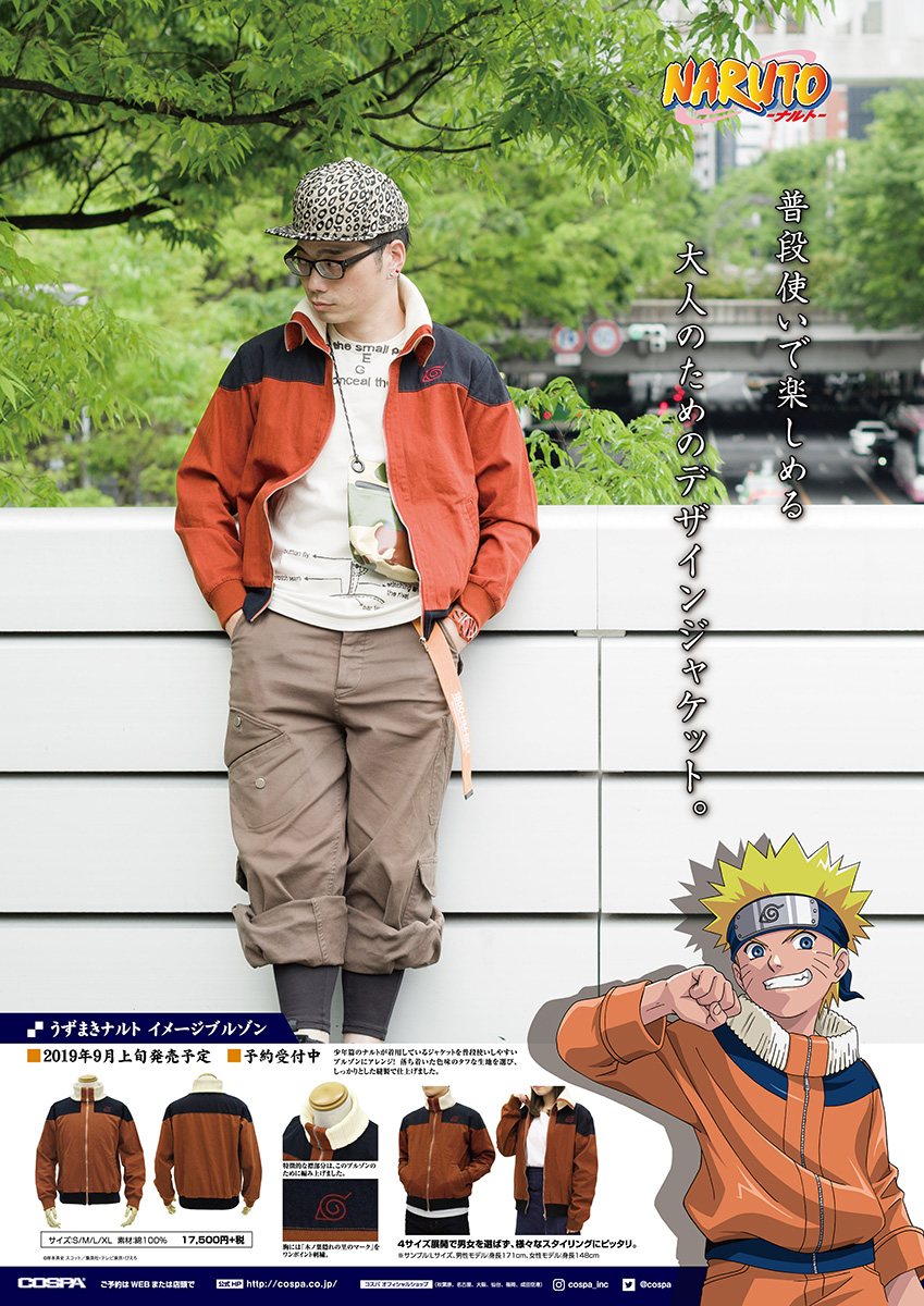 『NARUTO』より、少年篇のナルトが着用しているジャケットを普段使いしやすいブルゾンにアレンジしたアイテムが登場。価格は17,500円+税 。