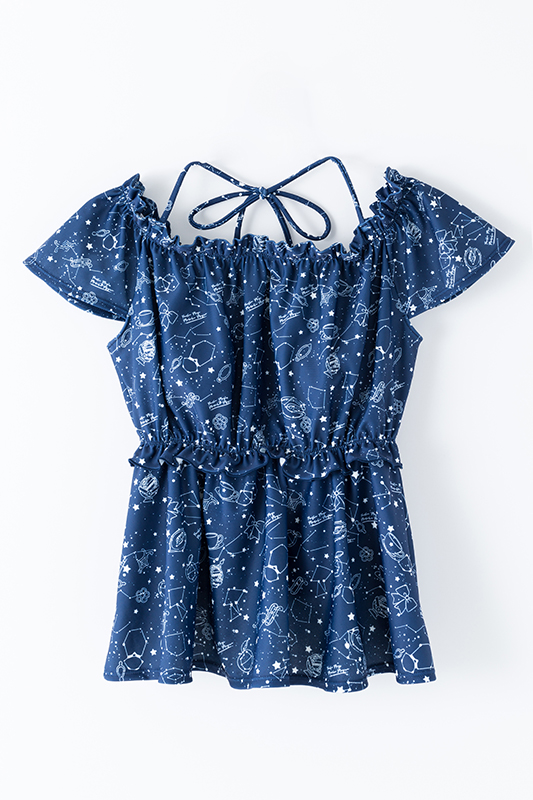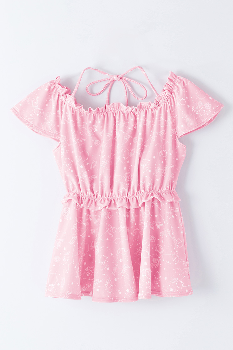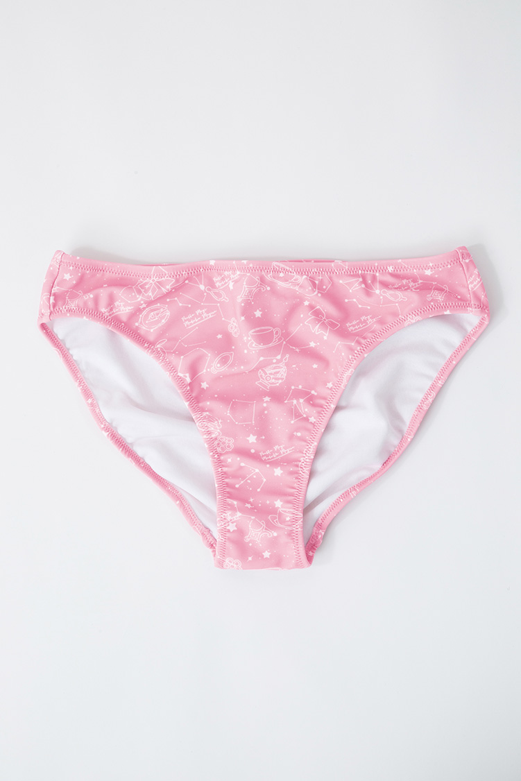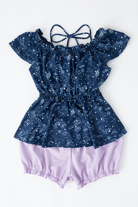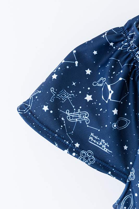 発売されるのは、鹿目まどかと暁美ほむらの2タイプ。どちらも、この水着オリジナルの「星座柄テキスタイル」が使用されている。ソウルジェムや、それぞれのキャラクターをイメージしたモチーフを、架空の星座に見立てているということ。生地の色使いはもちろん、水着の柄もとてもキュ~ト…♪ 水着部分とは色合いの異なるショートパンツもセットになっているので、露出を控えめにしたい人にもオススメ。