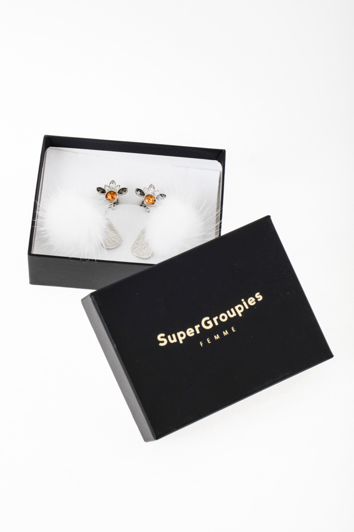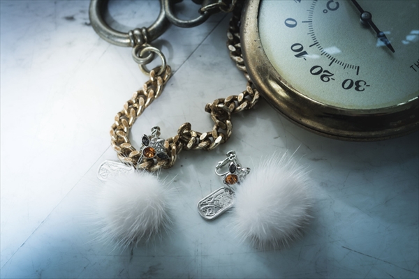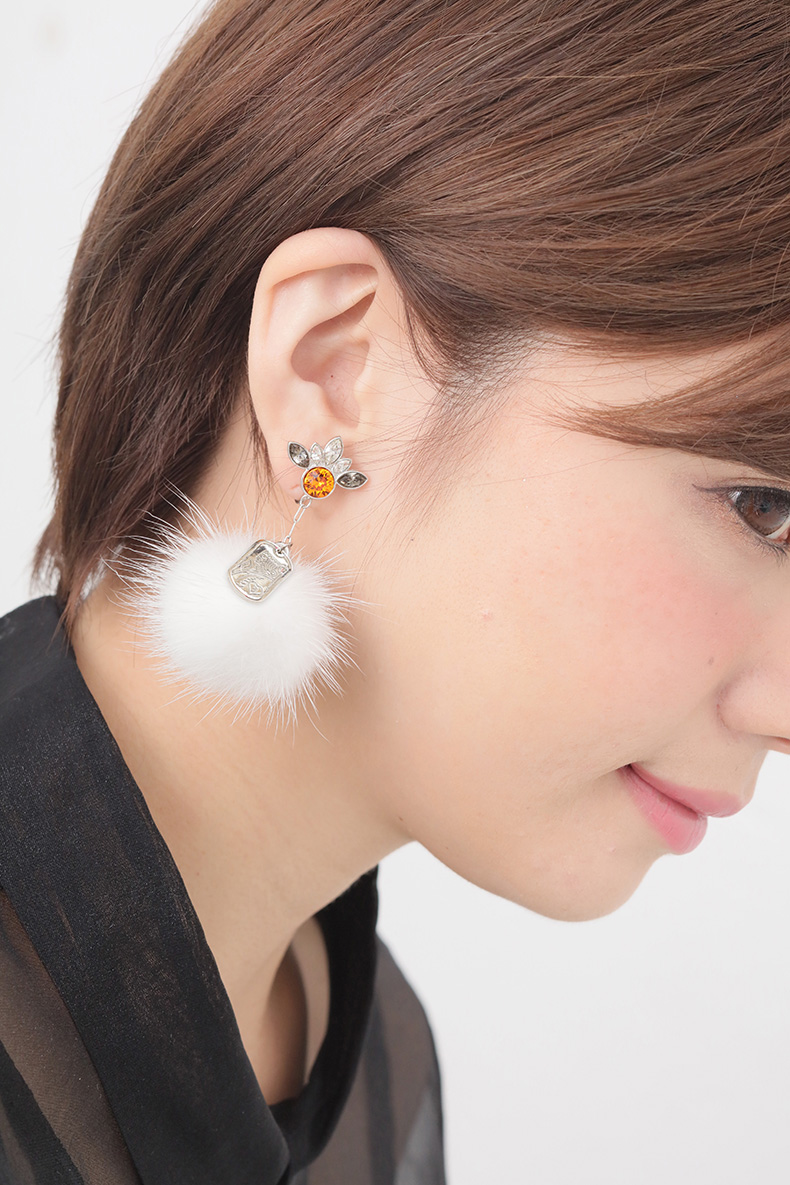 イヤリングは、アキラモデル。彼のジャケットのファーをイメージしており、この部分は取り外して使用することが可能だ。