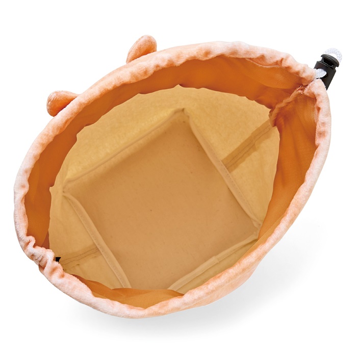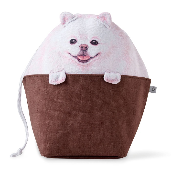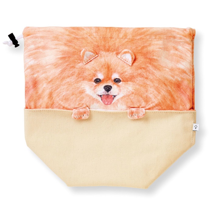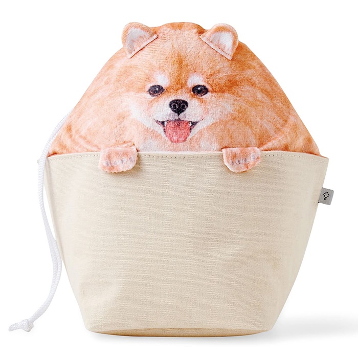 本商品は、まるっこいポメラニアンのフォルムをそのまま生かしたきんちゃく袋。きんちゃくのひもをしぼると笑顔のポメラニアンがボックスから飛び出しているデザインに。うるうるした瞳でこちらを見つめる。