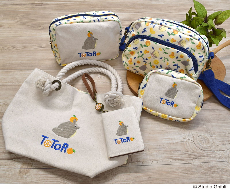 夏らしいオレンジ色が基調の夏みかんシリーズのテキスタイルは、大人の女性も身に着けやすく、これからの季節にぴったりの爽やかなデザイン。第2弾は日常使いしやすいショルダーバッグやランチトート、ポーチなどの布小物6アイテムと、大トトロや小トトロと夏みかんのモチーフがかわいいピアス2種類がラインナップ。