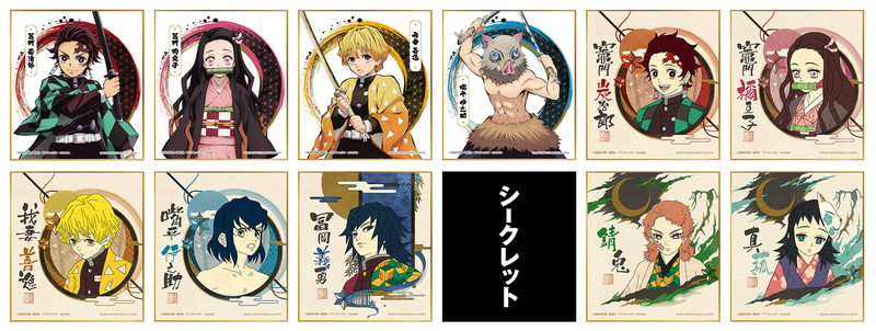 作中に登場するキャラクターが和のデザインに落とし込まれカラー色紙。シークレット1種含めて、12種類からいずれかが当たる。