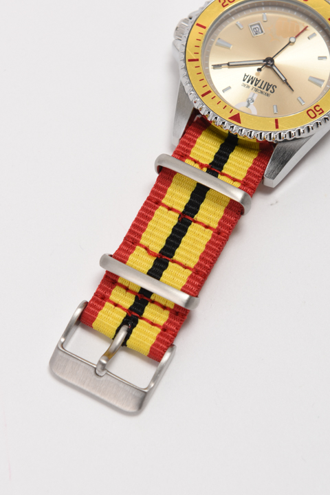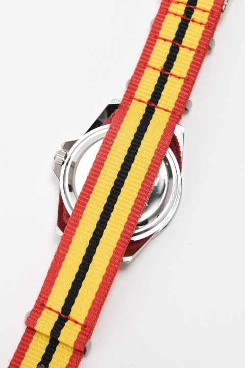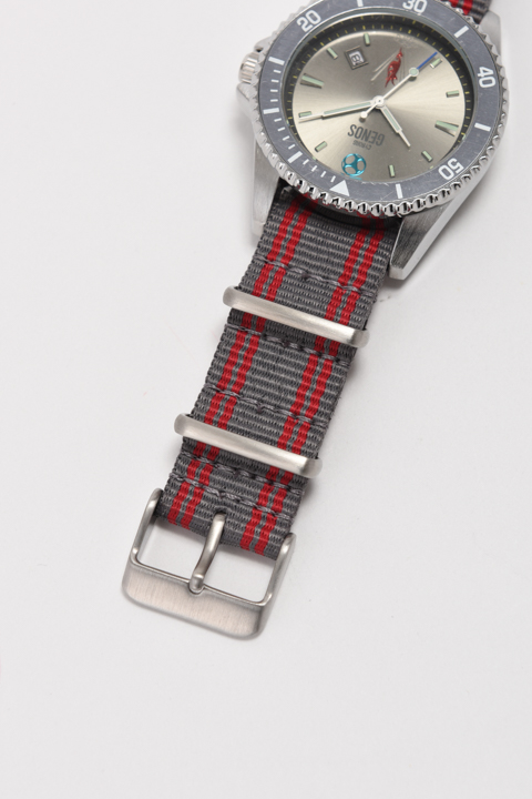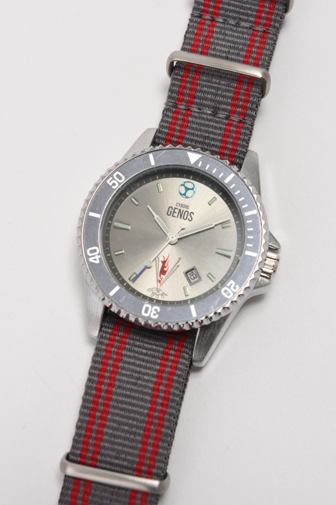 ナイロンベルトには、各キャラクターのカラーを配しており、そのほかにもサイタマモデルにはファスナーとパンチマーク、ジェノスモデルにはエネルギーチャージコアと焼却砲から出ている炎、ソニックモデルには手裏剣と刀のアイコンを12時と6時の位置にあしらっている。