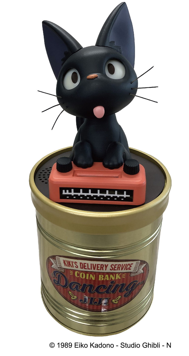 コインを入れると『魔女の宅急便』の映画の楽曲に合わせて動くジジの貯金箱。ラジオ型の硬貨投入口にコインを一枚入れると、楽曲のリズムに合わせてジジのまぶたや首、舌などが動く。楽曲は7種類で、ランダムで変わる。