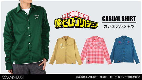 各キャラクターをイメージしたカラーリングのボディをオックスフォード生地やネル生地、デニム生地でそれぞれ仕上げたカジュアルシャツ。胸元には”個性”をイメージしたモチーフ、裾には雄英高校の校章をタグとしてあしらっている。すっきりとしたシルエットで、カジュアルに使える。