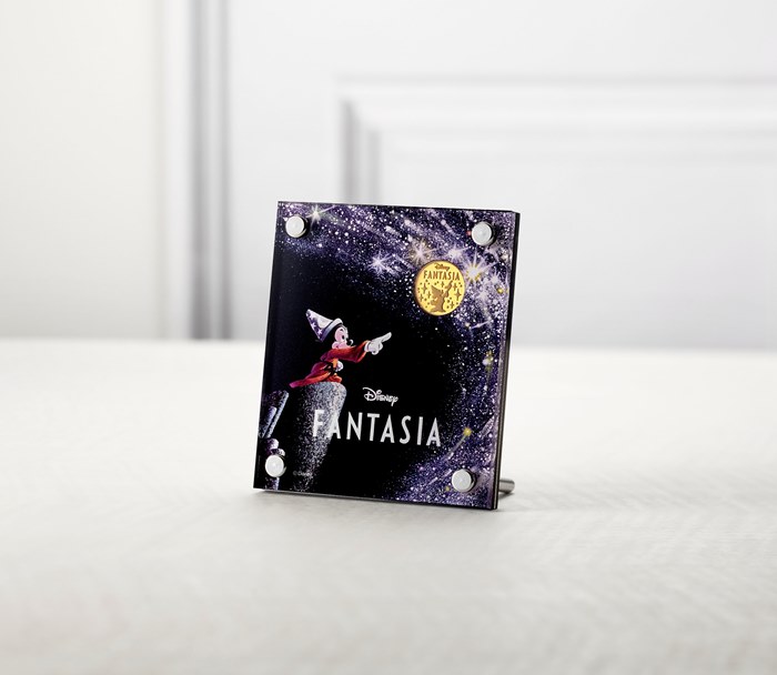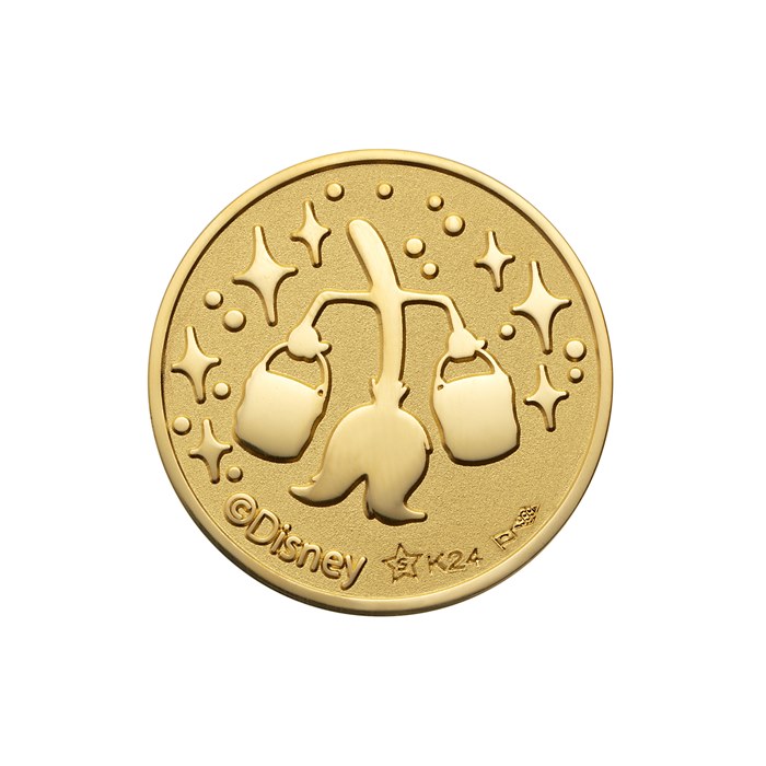 2019年11月30日まで限定で発売されているミッキー90周年を記念した特別純金メダル。貴重な「ファンタジア」のアートを刻印した期間限定デザインは、リバーシブルでお楽しみいただけるのが特徴です。また、アクリルフレームには、魔法をかけられたホウキ達が登場。表面から裏面へ、ストーリーがつながる仕様となっています。8gのほか、3gと16gの重さをご用意しています。