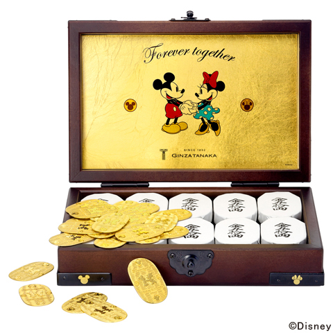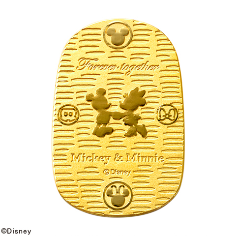 世界中で愛されているミッキーマウスと永遠のガールフレンド、ミニーマウスの微笑ましい姿をシルエットで表現した純金製小判 5g×50 枚をセットにした千両箱です。日本の伝統である小判特有の茣蓙目(ござめ)模様を全体に施し、小判中央にはミッキーマウスとミニーマウスのシルエット、上部には「Forever together(永遠に一緒に)」のメッセージが入った特別な贈り物にもおすすめな小判です。
