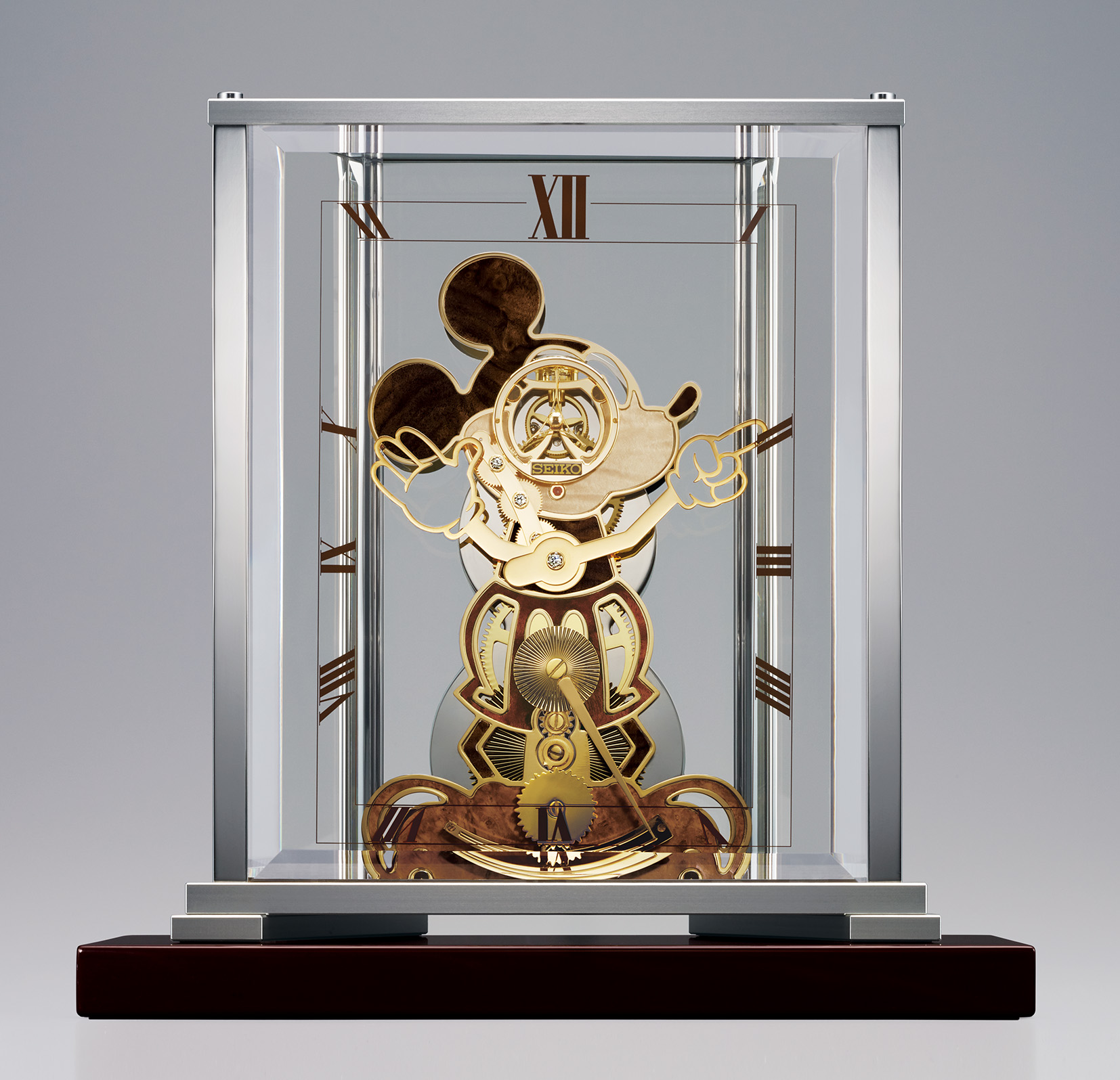 日差±2 秒というセイコークロックが世界に誇る機械式ムーブメントと、丹念に加工したひとつひとつの上質な素材を、熟練の職人が精魂込めて組み立てた MADE IN JAPANの価値ある逸品です。 高級木材の持つ本来の色を染色することなくそのまま活かし、ミッキーマウスのシルエットに息を吹き込みました。自然な風合いが上品且つ存在感を醸し出します。