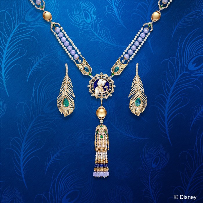 ディズニー最新作『アラジン』の世界観を様々な宝石で表現した、特別な一品。孔雀のように気高く美しい王女が求めたもの、それは自由。偽りのない清らかな心と出会い、いま空高く飛び立つジャスミンの姿を表現した、こだわりのデザインです。