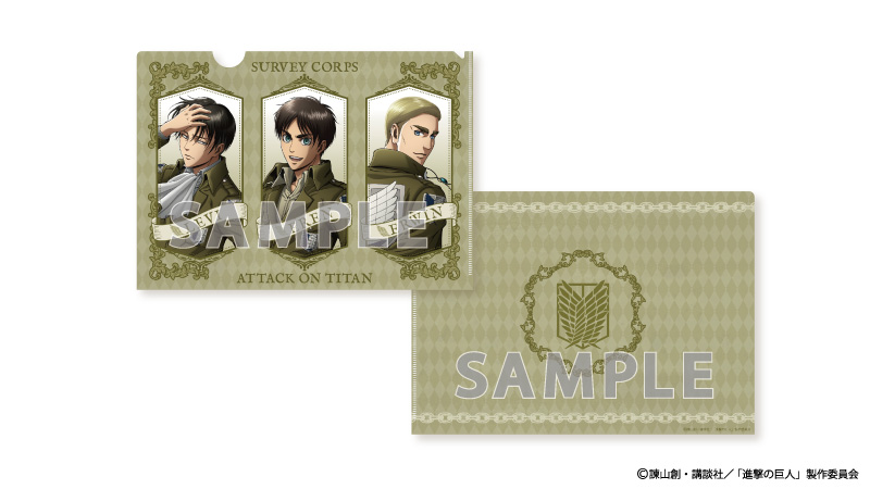 “A4クリアファイルが描きおろしイラストで登場!コートをなびかせたエレン、リヴァイ、エルヴィンの描きおろしイラストを使用した、定番サイズのクリアファイル。