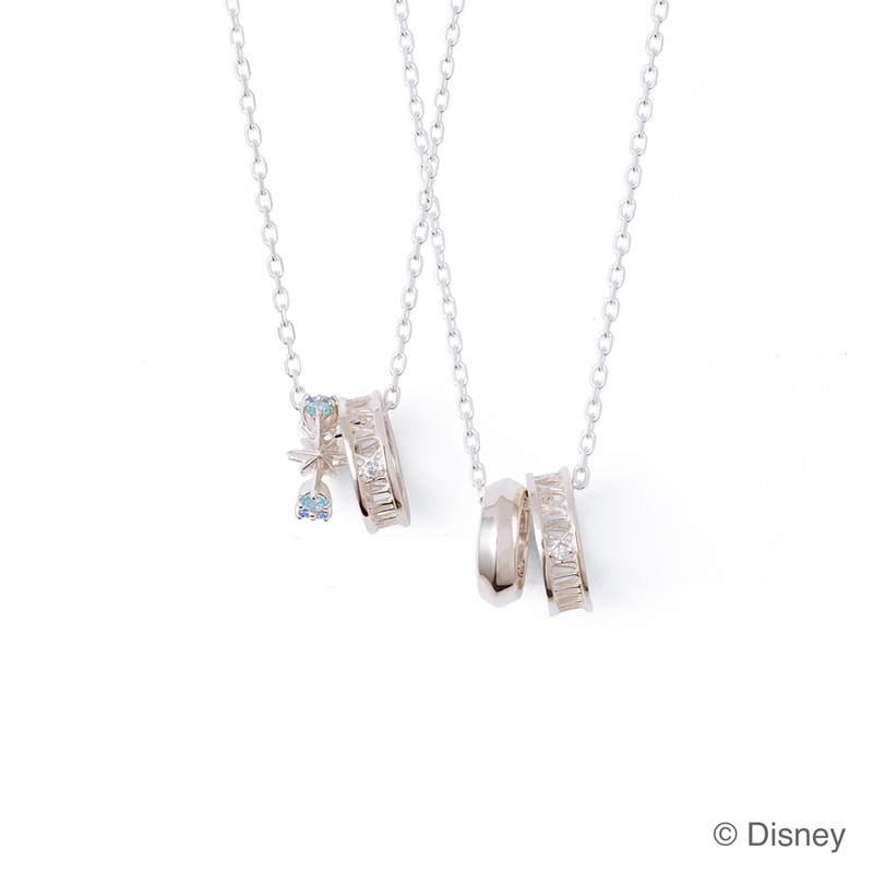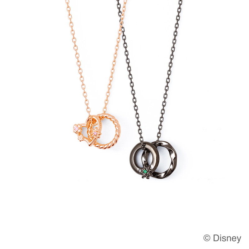 ディズニープリンセスコレクションのペアネックレス。 レディースはラプンツェルの髪をイメージしたリングと、髪飾りの花々があしらわれたハートモチーフをデザイン。 メンズは豊かな自然の中にある木の幹をイメージしたリングと、王国の紋章である太陽のマークを象った2つのリングが組み合わせられている。それぞれラプンツェルとフリン・ライダーをイメージしたカラーストーンがセットされたネックレス。