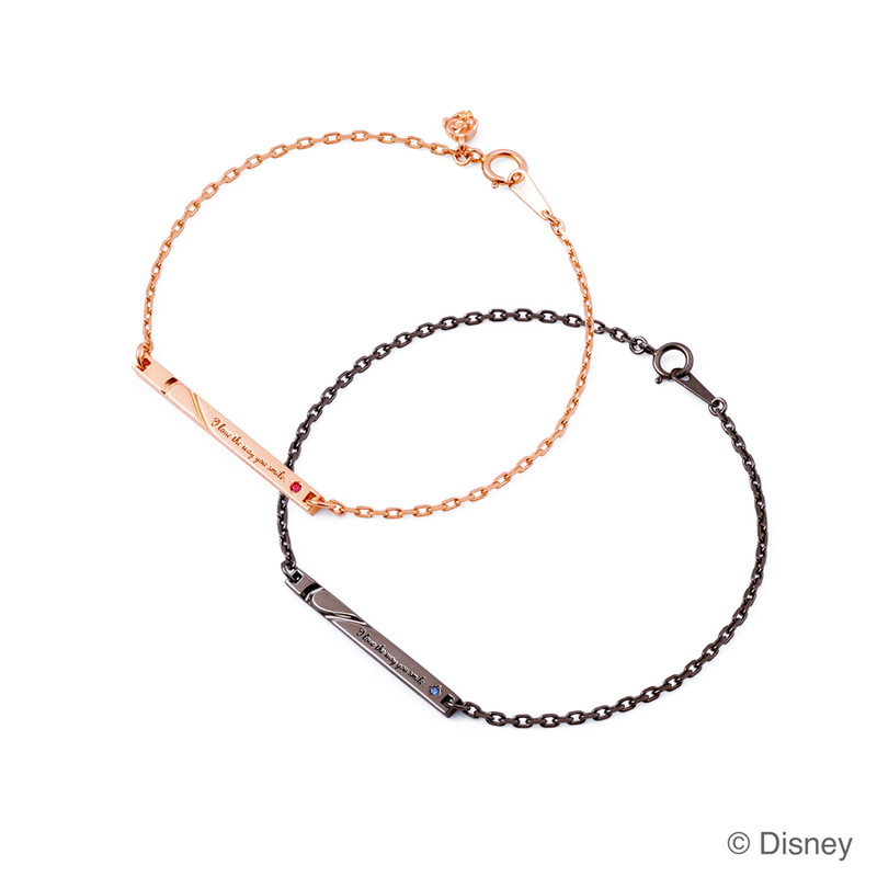 ディズニープリンセスコレクションのペアブレスレット。『美女と野獣』のキーアイテムであるバラが、レディースはチャームに、メンズは刻印でさりげなくデザインされている。トップには、“I love the way you smile(あなたの笑顔が大好き)”の文字が刻印されている。ふたつを合わせるとハートが現れる“Duet”シリーズだ。