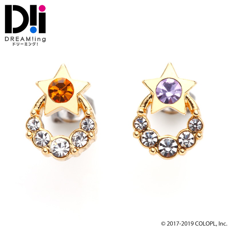 ゴールドのカラーをベースに“ゆめライブ”をイメージした月と星のモチーフデザインとそれぞれのカラーのストーンがワンポイントになったピアス/イヤリング。“ペア”をテーマにしたデザインで、左右で異なるカラーのストーンが配置されている。推し“ペア”もさりげなくアピール出来つつ、シンプルなデザインなのでデイリーにも使えるアイテムだ。