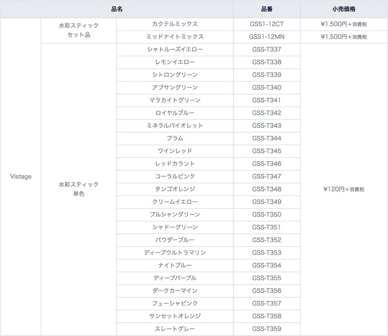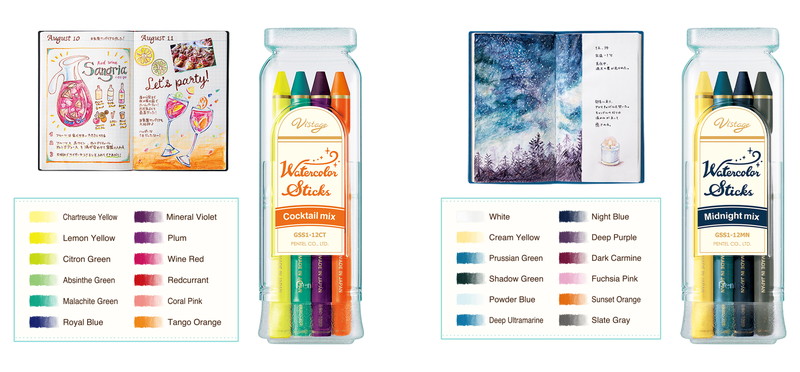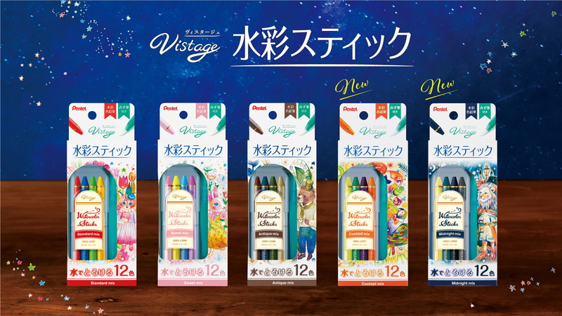 “Vistage(ヴィスタージュ)水彩スティック”は、“22時からはじまる、わたしだけの彩る時間”をテーマに、ライフログノートにも気軽に使える、大人の女性向けの趣味画材として2018年8月に発売された。この度、より深みのある新色セット“カクテルミックス”、“ミッドナイトミックス”の二種類が追加された。