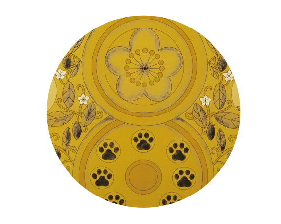 土台の蓮台(れんだい)部分は、適度なカーブがつめをとぎやすく、上で寝転ぶのにも心地よい形状。蓮の花弁を模した舟形光背には、女流仏像画家の田中ひろみさんが描く化仏(けふつ)にゃんこがちりばめられ、またたびの実や枝を唐草模様風に表現している。