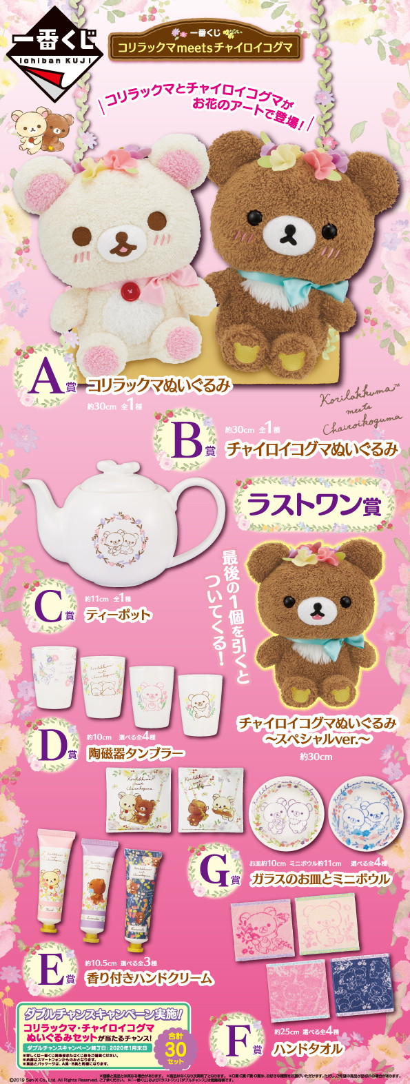 コリラックマ&チャイロイコグマの一番くじが発売。ふわふわのぬいぐるみやお花デザインの雑貨がラインナップ
