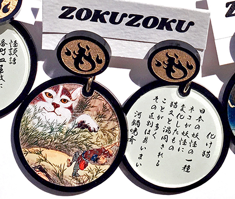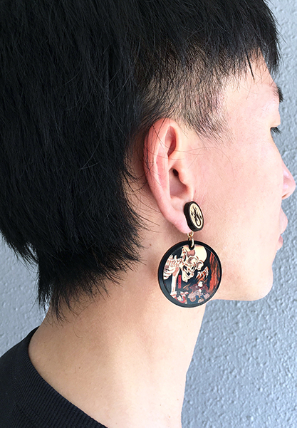 これからのハロウィンの季節にもピッタリな幽霊や妖怪をモチーフにしたホラーテイストの耳飾り。葛飾北斎や歌川国芳、河鍋暁斎などの有名な浮世絵を、工業用の大型プリンターでアクリルに直接プリント。片耳は絵柄、片耳はそれぞれの説明が描かれている。カラーを黒と金で統一。普段使いでも格好よく粋に着こなそう。