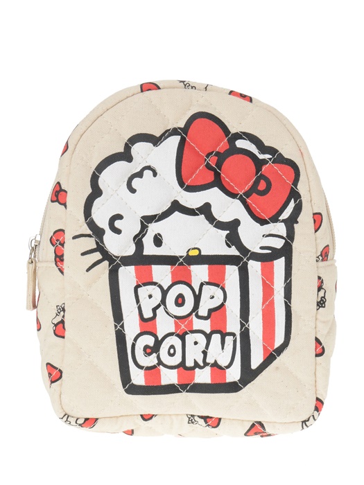 ポップコーンに隠れているハローキティとリボンの総柄が愛らしいキルティングポーチです。