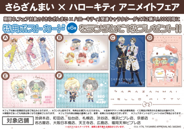 特典の『ポストカード(全6種)』をランダムで1枚プレゼント。ポストカードのデザインには、アニメ公式描き下ろしイラストはもちろん、本フェアに合わせてサンリオがデザインプロデュースし描き起こした新星玲央と阿久津真武のミニキャラver.とカッパver.のイラストも登場する。特典はなくなり次第終了となるので、早めにGETしていただきたい。